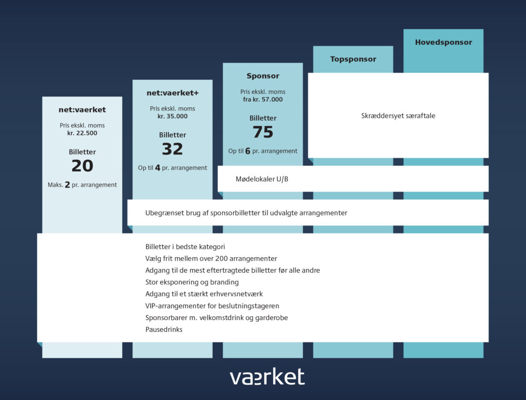 En sponsoraftale på Værket gælder for et år ad gangen, men det er naturligvis også muligt at tegne for flere år ad gangen eller eksempelvis opjustere antallet af billetter i en skræddersyet sponsoraftale – det tager vi en dialog om. Nedenfor kan du se, hvilke fordele du får ud af vores enkelte sponsorpakker.